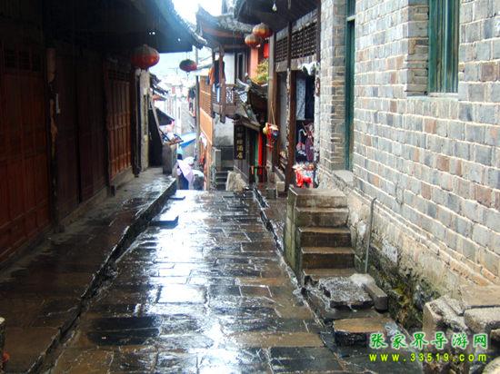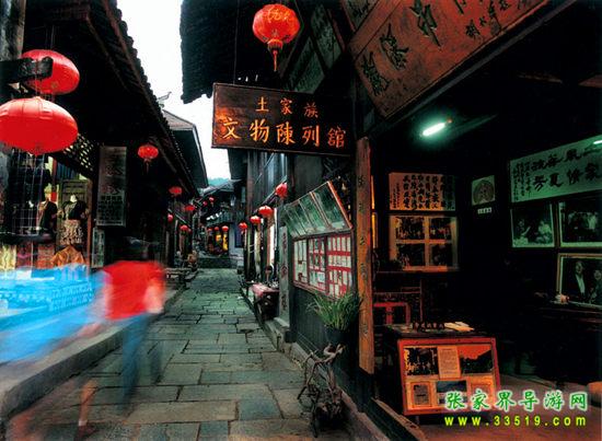 拾級(jí)而上,山路一般的陡峭。從碼頭開始綿亙而上的石階,那是一條長達(dá)五里貫穿古鎮(zhèn)的青石板路,它沒有名字,于是人們就直接管它叫五里長街。踏上古街,似乎踩在被悠長歲月遺落的碎片上面。不知不覺走到掛有“土家觀瀑吊腳樓”牌匾的民俗博物館前,從手搖腳踏的棉花機(jī)、閹豬鳴號(hào)的羊角到世代相傳的雕花牙床,近百件散發(fā)著鄉(xiāng)土氣息的民間用具,展示著土家族古老豐富的歷史。看護(hù)人說,這是一位土家族年輕人爬山涉水收集來的,靜靜地訴說著這個(gè)小村古老的過去。這棟三層的小樓,一半落在河岸上,另一半?yún)s是由水泥柱支撐著,水泥柱直插河底,任水流日日夜夜地沖刷,小小的吊腳樓仍穩(wěn)穩(wěn)當(dāng)當(dāng)站在那里,任憑時(shí)間的流逝。好聰明的土家人,巧借一片水面,竟建起了如此妖嬈的住房。