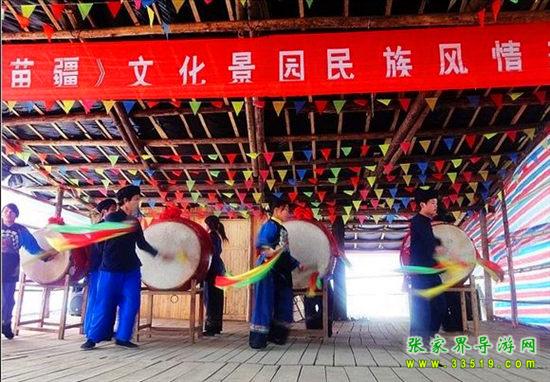 夢幻苗疆進寨必須經(jīng)過苗族人民接待遠方賓客的歡迎儀式“攔門三卡” 唱攔門歌、喝攔門酒、敲苗家花鼓,通過后,方能進寨。