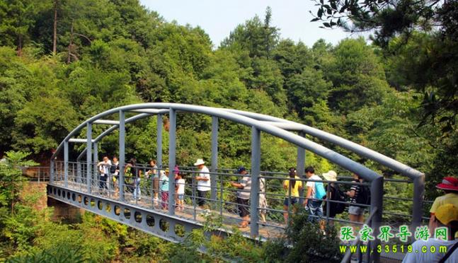 這是一座鋼棧橋,全長23.8米,凈跨20.4米,寬1.9米。下梁是兩根鋼質(zhì)工字梁,上梁是兩根鋼管拱梁,鏈接兩根工字梁的次鋼梁14根,水平鋼管5根。殼體小巧玲瓏,連接兩座結(jié)構(gòu)復(fù)雜的山峰,構(gòu)成一道離奇絢麗的連心景觀。