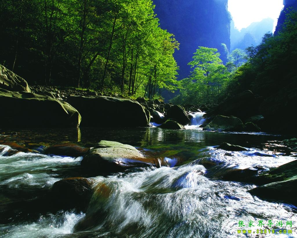 金鞭溪穿行于深壑幽谷之間,溪的兩邊千峰聳立,高入云天,樹木繁茂,濃蔭蔽日,這兒溪水潺潺、琉璃飛瀑,奇花異草與珍禽異獸同生共榮,構(gòu)成極為秀麗、清幽、自然的生態(tài)環(huán)境,被稱為“世界最美的峽谷”,“最富有詩意的溪流”。