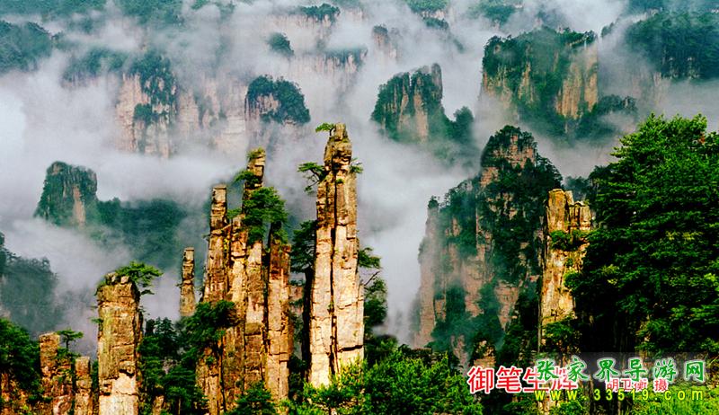 眼前這幾支細(xì)細(xì)瘦瘦的山峰,好像一支一支、一節(jié)一節(jié)地從這個(gè)峽谷中長出來的一樣,形狀很像一排倒插在筆筒中的毛筆。筆尖、筆桿可以分得清清楚楚,尤其是頂部一些不大不小的松樹,剛好像是毛筆的筆毫!這簡直就是出自能工巧匠之手!山長成這樣子多么不容易啊,它經(jīng)過億萬年流水切割、風(fēng)雨侵蝕、重力崩塌等多種復(fù)雜的地質(zhì)作用才最終形成。除了大自然,誰有這樣的匠心和耐心,對(duì)堅(jiān)硬如鐵的石英紗巖進(jìn)行這樣的精雕細(xì)刻?有人說,張家界如詩如畫的風(fēng)景,就是這幾支筆以青山綠水為線條,以風(fēng)花雪月為色彩,以時(shí)間空間為畫紙畫出來的。