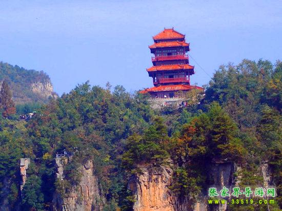這是六層四重檐穿頭式仿古建筑,高30米,由深圳市政府捐建。建立之初,本打算取名叫“深圳閣”,但遭到許多人(包括深圳人)反對(duì),認(rèn)為這樣與整個(gè)天子山的風(fēng)景不是很協(xié)調(diào)。不過從另一個(gè)角度來看,深圳人這種“經(jīng)營城市”的意識(shí),卻非常值得張家界人學(xué)習(xí)。“欲窮千里目,更上一層樓”,登樓遠(yuǎn)望,天子山群峰盡收眼底,別有一番風(fēng)景。