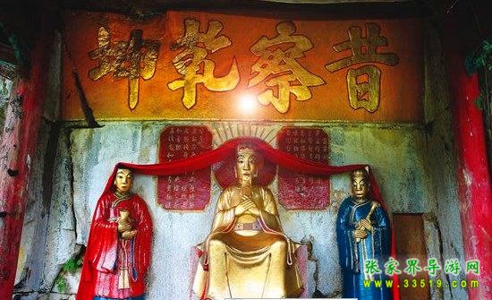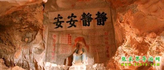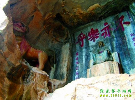 玉皇洞石窟位于張家界城西約7公里的麻空山南壁,為清代本地鄉(xiāng)紳李京開獨資捐修。李京開又叫李五瑞,別名九洞樂,號識破生。他生于乾隆七年(公元1742年),道光乙酉年(1825年)去世,享年83歲。李先生家道殷實,富甲一方。少時勤奮讀書,頗有才華,數(shù)十年奔波仕途,但屢試不第,官場無望,于是看破紅塵,另尋安慰,請工匠,耗巨資,憑借麻空山天然溶洞,按上、中、下方位布局,巧妙構(gòu)思,開鑿成“天堂”、“人間”、“地府”三層共八個洞。另外,在離此約3公里的峰泉洞另鑿一洞,故有“九洞樂”別名。玉皇洞石窟上層為玉皇洞,人間層有玉金洞、毫筆洞、墨池洞、虎龍洞、雄獅洞、孔圣洞,地府為因果洞,八洞組成一個完整的混沌世界。居八洞之首的玉皇洞,雕有玉皇大帝神像,意為“天堂”至尊,統(tǒng)帥中層的“人間”和下層的“地府”,故八洞統(tǒng)稱玉皇洞。此洞于1799年動工,到1807年完成,歷時八年。洞內(nèi)雕鑿了一些歷史人物的神像以及大量詩詞匾對,不僅石雕精湛獨特,雕像神韻生動,書法遒勁大氣,而且在石窟藝術(shù)的主題構(gòu)思上,抒發(fā)了主持捐修者李京開懷才不遇、憤世疾俗、向往太平盛世的情感,鞭達了腐朽的科舉制度,對于研究清代社會和科舉制度,以及當時一般讀書人的思想情感,都具有一定的史料價值。整座洞窟東西長300余米,現(xiàn)存石像19尊,石刻50多處,是湖南省唯一保存完好的石窟藝術(shù)群,1959年玉皇洞被列入湖南省重點文物保護單位。