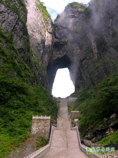 天門洞位于天門山山體的中上部,是世界上最高海拔的天然穿山溶洞,海拔1300米 ,其高131.5米,寬57米 ,深60米。它南北對(duì)開于千尋素壁之上,扶搖而通天,似明鏡似天門鑲嵌于蔚蔚天幕之上,終年吞云吐霧,蔚為壯觀中更加神秘莫測(cè)。“天門洞開云氣通,江東峨眉皆下風(fēng)”元朝的著名詩(shī)人張兌曾這樣贊嘆,磅礴的氣勢(shì)由此可見。1700多年來,這一道奇絕天下的勝景吸引著無數(shù)的探訪者趨之若騖。特別是在1999年,世界特技飛行大師架機(jī)穿越天門洞,在全球引發(fā)了轟動(dòng)效應(yīng),收看現(xiàn)場(chǎng)直播的觀眾達(dá)到8億之多。