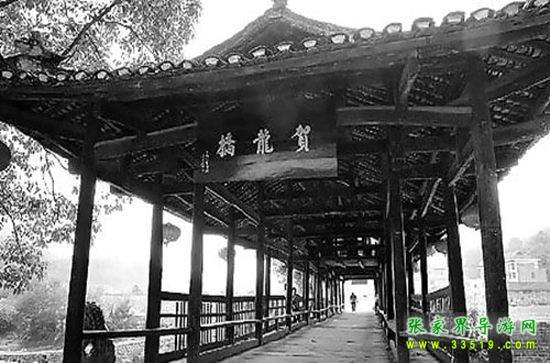 賀龍橋原稱“永安橋”。飛架于賀龍故居右側(cè)玉泉河上,是一座石墩、木粱、騎廊的風(fēng)花橋。東西長40米、寬7米、高8米。龍爪翹檐,中聳堡亭,8尊石獅,分置橋頭及石墩之上,造型渾厚古樸,富有民族特色。此橋原是溝通桑植內(nèi)外半縣的必經(jīng)之道,是上川鄂下津澧的要津,也是當(dāng)年鹽局奪槍、桑植起義的發(fā)端處。系賀龍曾祖父賀廷宰首倡捐資修建,幾番修而復(fù)圮。至1916年,終由賀龍父親賀仕道襄修告竣。1929年冬,桑植“剿共”司令陳策勛,謂以破“賀氏風(fēng)水”,令毀此橋。解放后,桑植縣人民政府于1952年冬按原樣復(fù)修,命名“賀龍橋”。“文化大革命”動亂中,林彪、“四人幫”誣陷賀龍,指使“紅衛(wèi)兵”毀橋,群眾奮起護(hù)衛(wèi),才幸免劫難。1983年5月,賀帥女兒賀曉明應(yīng)縣政府請求,得全國書法家協(xié)會秘書長謝德萍書匾“賀龍橋”,高懸橋之東西首,永志紀(jì)念。1978年,賀龍故居及其生平業(yè)績陳列室、賀龍橋,列為省級重點(diǎn)文物保護(hù)單位。凡到賀龍故居、賀龍紀(jì)念館的游客這是必經(jīng)之地。