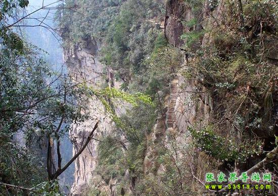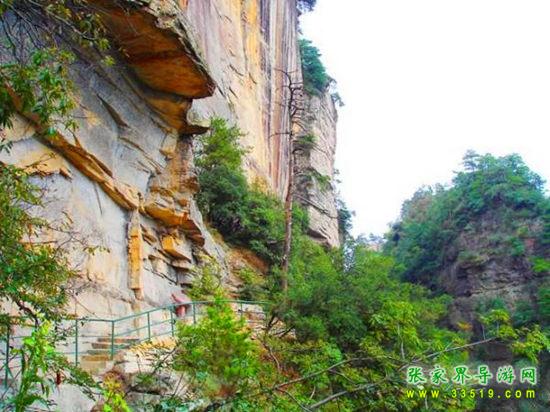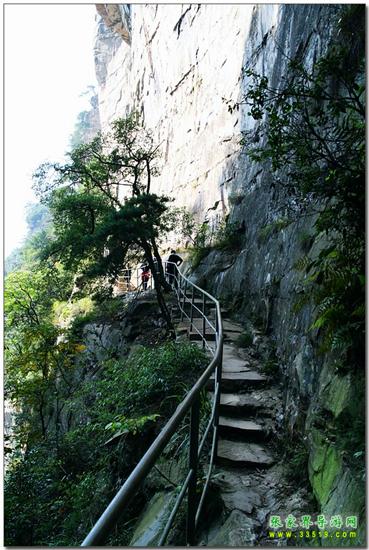由群仙開宴景點沿石徑蜿蜒而下約200米處,一巨峰于半腰分裂,內(nèi)可行人,長300米,寬0.1-1米。南側(cè)懸崖峭壁,深不見底。北側(cè)石壁高50米,抬頭不見其頂。人行其內(nèi),如置身空中長廊。廊中虬松懸崖,亂云飛渡,山風(fēng)呼嘯。廊之東、南和西南三面峰立如林,或如城墻,或加堡壘,各呈奇舉。