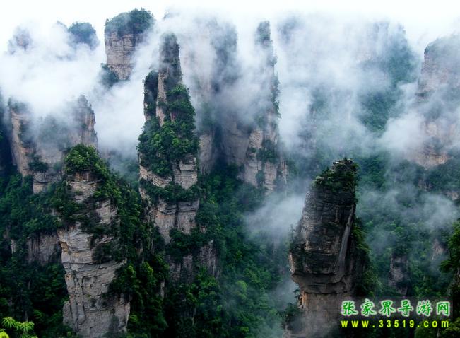 自“百龍電梯”西行五公里至中坪停車場,向南步行200米許,一石門天然洞開,渾圓如月。門西側(cè)絕壁上有一凹臺(tái),頭頂危巖,下臨深淵,長20多米,平均寬1.5米。幽谷中林木繁茂,芳草叢生,數(shù)十座玲瓏剔透的石峰爭奇斗巧,顯得無限深邃,無限幽遠(yuǎn)。石峰由低漸次升高,色彩由深到淺,由明變暗,形成十多個(gè)層次與灰黑色的朝天觀相連,遠(yuǎn)處還有迷蒙的群山。陽光直射幽谷時(shí),石峰獨(dú)立顯形,輝綠映丹,構(gòu)成一幅意境超然,氣勢磅礴,色彩清新的畫卷。雨天則云霧如海,峰林飄搖,似幻非幻。