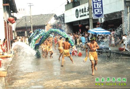 張家界潑水龍又叫“澆水龍”,于唐朝時期由移居本地的白族興起演變而成,在永定區(qū)的尹家溪鎮(zhèn)西尹村、莫家崗村十分盛行,是當(dāng)?shù)?a class="insidelink" href="http://theopnsports.net/fengqing/" title="土家族">土家族,白族、苗族在天熱干旱時節(jié)求雨祈福的一種形式。一旦出現(xiàn)旱災(zāi),當(dāng)?shù)仡^面人物就會出來組織潑水龍,演出極其隆重。