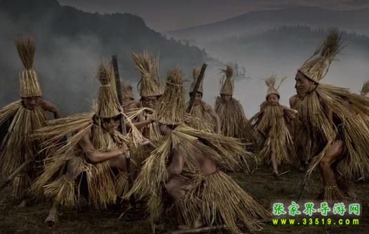茅古斯雖然還不是成熟的戲劇形式,但已有模擬遠古先民勞動和生活的故事情節(jié),并通過舞蹈、道白來表達內(nèi)容。通常由15人表演。表演者頭戴尖頂齊脖茅草帽,頭扎草辮,全身皆用稻草包扎,象征全身都長著毛的先民。演出時,有簡單布景,由一人領(lǐng)舞出場,茅古斯數(shù)人尾隨歡跳,抖動全身稻草,搖晃頭上草辮,以變嗓對話歌唱。表演內(nèi)容有刀耕火種、圍獵、捕魚、接新娘、先生教書、甩火把等。茅古斯表演從形式到內(nèi)容,都別具一格。演出自始至終講土話、唱土歌,但以對白為主體,觀眾也可答話插白。演員或歌或舞,或蹦蹦跳跳、翻跟斗、做游戲。或碎步進退,曲膝抖身,左跳右擺,搖頭聳肩,全都是模仿古人粗獷的憨態(tài)。形態(tài)滑稽,詼諧有趣。