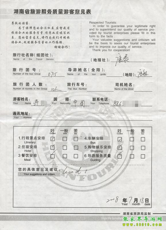 2009年7月15日許先生一行10人質量接待反饋單: