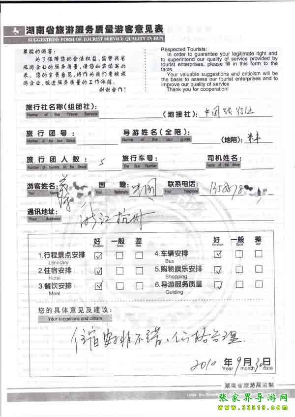 2010年9月30日菜小姐一行5位旅游質(zhì)量反饋:住宿安排不錯,價格合理