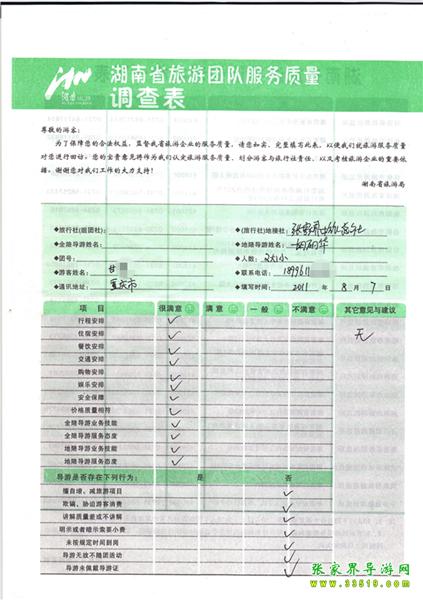 2011年8月7日甘先生一行3人旅游質(zhì)量反饋