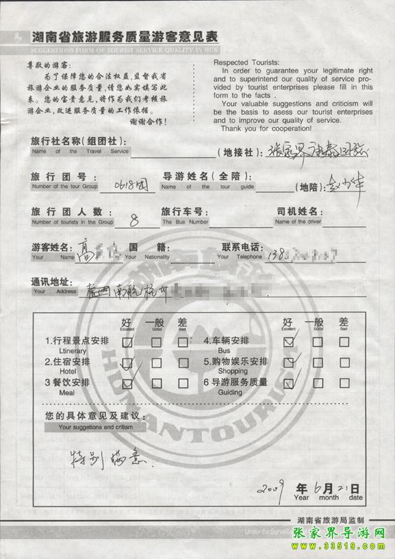 2009年6月18日高先生一行8人接待質量反饋單: