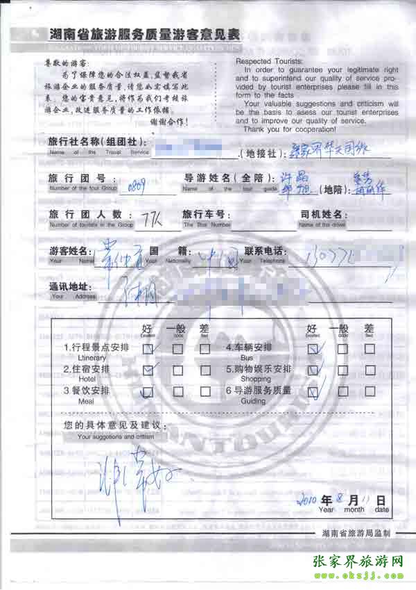2010年8月11日岳陽常先生一行77位旅游質(zhì)量反饋